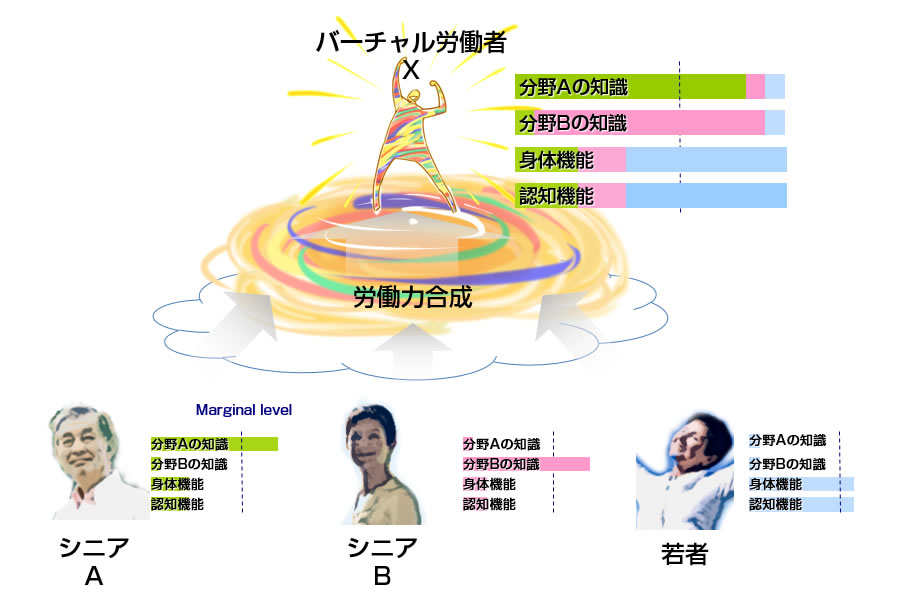 そこで高齢者にとって無理のない働き方として、『モザイク型就労』を提唱しています。 - モザイク型就労とは、就労条件をスキル、時間、場所の3つに分け、それらを組み合わせることで、バーチャルに一人分の労働力として提供する仕組みです。